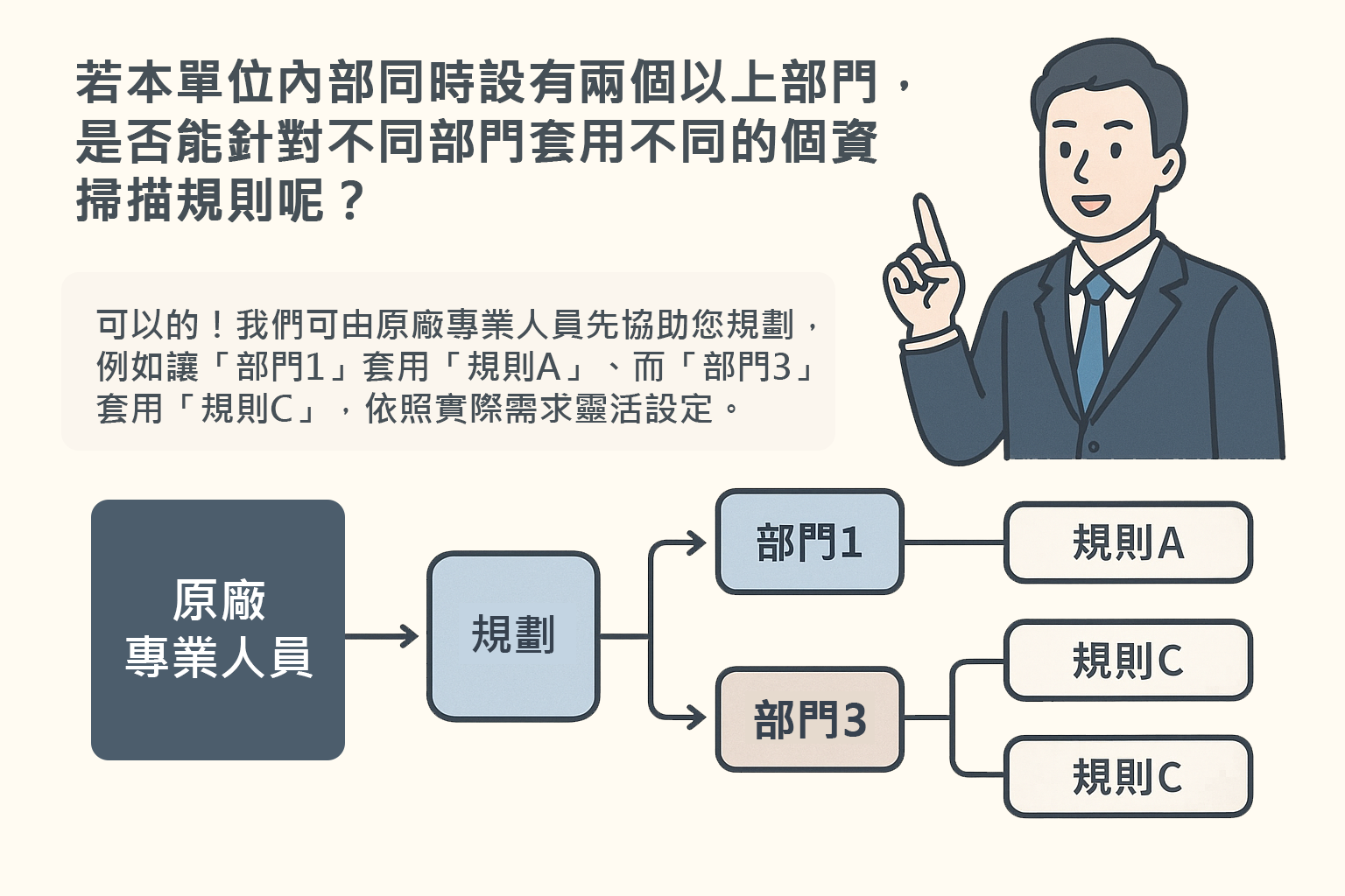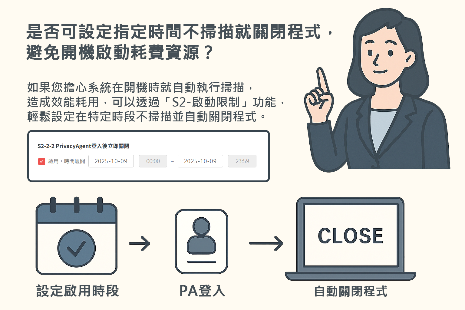 選擇使用個資盤點工具的理由 用戶情境分享 Q 若本單位內部同時設有兩個以上部門,是否能針對不同部門套用不同的個資掃描規則呢? 可以的!我們可由原廠專業人員先協助您規劃,例如讓「部門1」套用「規則A」、而「部門3」套用「規則C」... 查看更多 多規則設定 多部門個資盤點 Q 是否可設定指定時間不掃描就關閉程式,避免開機啟動耗費資源? 如果您擔心系統在開機時就自動執行掃描,造成效能耗用,可以透過「S2-啟動限制」功能,輕鬆設定在特定時段不掃描並自動關閉程式。... 查看更多 設定特定時段不掃描 避免開機啟動耗費資源